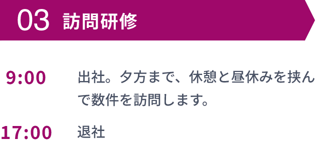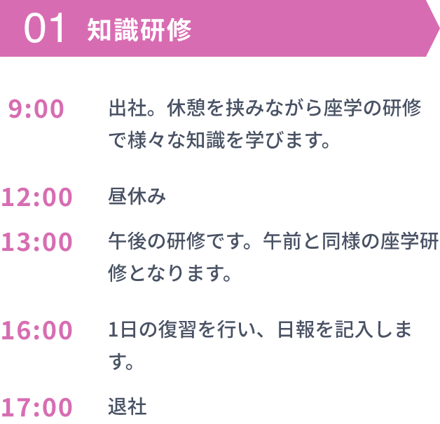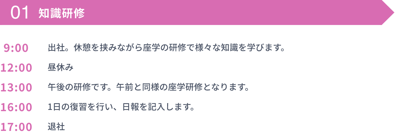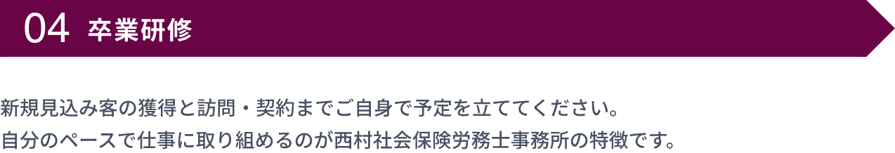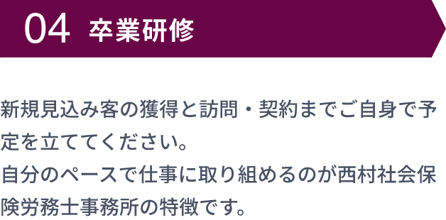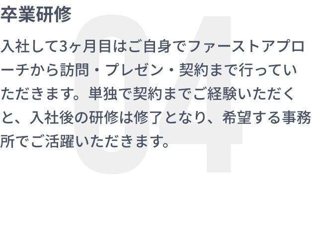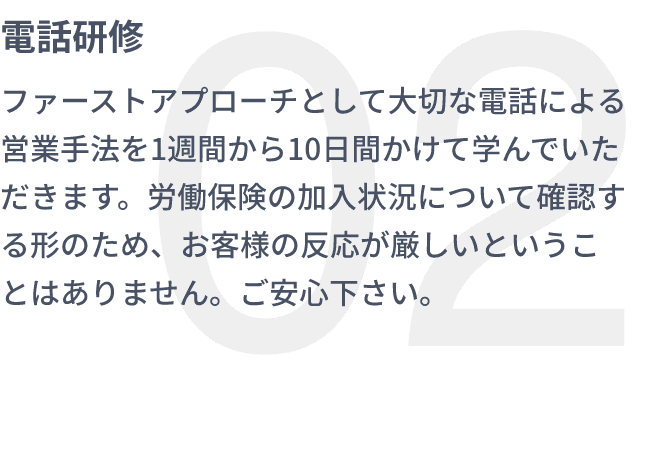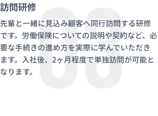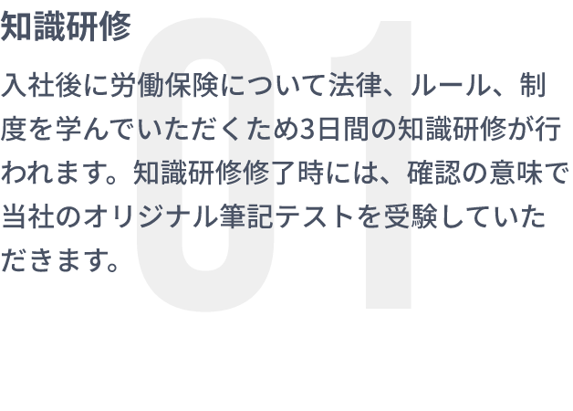 入社後は3ヶ月間にわたる研修で業務に必要なすべてを学んでいただけます。労災保険法や雇用保険法など関連する法律知識から新規・訪問・説明・契約といった詳しい営業手法まで専門スタッフが丁寧に指導しますので、未経験の方もご安心下さい。